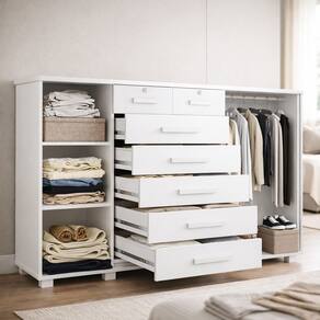 Seu grande diferencial está na versatilidade: além das gavetas espaçosas, o móvel conta com sapateira integrada e compartimentos amplos que permitem armazenar roupas, calçados e acessórios em um único lugar, otimizando o espaço do ambiente.