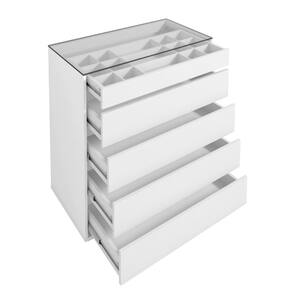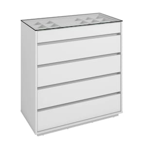 A Comoda 5 Gavetas Belize Casa D combina design moderno e funcionalidade para o seu quarto. Com cinco gavetas, incluindo uma superior com organizador interno para joias e relogios, seu tampo de vidro e estrutura em MDP de alta resistencia garantem durabilidade. Gavetas com corredicas telescopicas, pintura Print Wood exclusiva Casa D e bordas com acabamento Soft PU oferecem qualidade e estilo unicos.