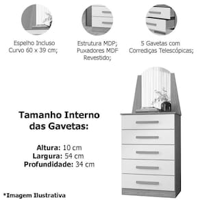 Característica da Cômoda Valentina: - Estrutura em MDP; - Acabamento de pintura em UV; - 5 gavetas com corrediças telescópicas; - Puxadores em MDF revestidos; - Espelho incluso curvo 60 x 39 cm; - Não acompanha itens de decoração ou quaisquer objetos fora o móvel na imagem;