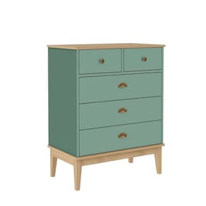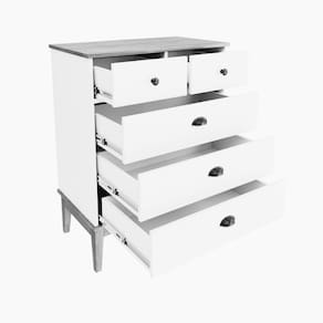 Características: 5 Gavetas Acabamento em Pintura UV Corrediças metálicas Estrutura em MDP 15mm / MDF 3mm Pés em madeira maciça Puxador Ponto Material do puxador Zamarc