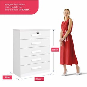Essa linda cômoda , com acabamento em MDF e pintura UV, era o que faltava para completar seu dormitório. Composta por 05 ( cinco ) gavetas super amplas e 01 ( uma) com chave , você poderá organizar todos seus pertences, e ainda ter a segurança de uma gaveta mestre com fechadura. Ela é o complemento perfeito para o seu quarto, com uma variedade de cores que atende a qualquer decoração. Não perca tempo e garanta já a sua. Produto Montado: Sim Acabamento da Gaveta: Pintura UV Ambiente Principal: Quarto codigo_ean: 7909903441671 Complexidade da Montagem: Baixa: pode ser montado por uma pessoa sozinha Cor: Branco Cor do Produto: Branco Escala de Brilho: Brilhante Gaveta com Chave: Sim Itens Inclusos: 1 Cômoda, Kit Ferragens e Manual de Montagem Manual de Montagem e Instalação: https://product-hub-prd.madeiramadeira.com.br/872840/documents/808dd8dd-537c-427c-9ef4-dae3628158351557362comodaipanema.pdf Material da Gaveta: MDP Material do Fundo: MDF Material Principal: MDP Necessita Montagem: Sim Origem do Produto: Nacional Peso: 45 kg Peso Máximo por Gaveta: 5 kg Possui Espelho: Não Possui Nichos: Não Possui Pés: Não Possui Portas: Não Possui Prateleiras: Não Quantidade de Gavetas: 05 Gavetas Recomendações de Uso, Manutenção e Limpeza: Pano levemente umedecido e depois passar um pano seco. Não utilizar produtos de limpeza abrasivos, nem esponjas de aço. Sapatas Niveladoras: Não Sistema de Montagem: Parafusos, Cavilhas Suporta Até (kg): 30 kg Tipo de Corrediça da Gaveta: Metálica Telescópica Tipo de Puxador da Gaveta: Externo Ean: 7909903441671