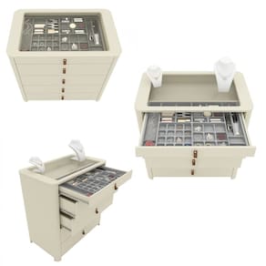 Características: 5 Gavetas laterais 480x140x15cm fundo 746x140x15cm Cantos curvos Corrediças telescópicas Estrutura em MDF Kit pés 60x60x50cm Porta joia 730x488x42cm Puxadores em poliestireno Tampo 912x546x18cm com vidro 739x415x04