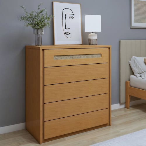 A Cômoda 5 Gavetas é a escolha perfeita para quem busca praticidade e elegância em um só móvel. Com detalhe em ratan e estrutura resistente, ela se adapta facilmente a diversos ambientes, como quarto, escritório ou sala. Suas gavetas amplas proporcionam excelente espaço para organização de roupas, acessórios e objetos pessoais. O acabamento amadeirado confere um toque natural e sofisticado, tornando o ambiente mais aconchegante e moderno. Compacta e funcional, é ideal para otimizar espaços com estilo.