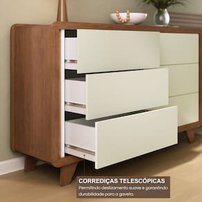 Conta com corrediças telescópicas, que garantem deslizamento suave e maior vida útil das gavetas, além de puxadores embutidos no MDF, que valorizam o design limpo e sofisticado. Os pés elevados facilitam a limpeza e manutenção do ambiente, enquanto os detalhes curvos proporcionam elegância e personalidade ao móvel.