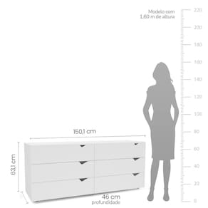 A cômoda 6 gavetas Porto, da Politorno Móveis, combina design moderno, elegante e sofisticado, agregando requinte ao ambiente. Produzida em MDP/MDF, conta com acabamento em pintura UV e FF, proporcionando maior resistência e durabilidade. Seus puxadores embutidos garantem um visual clean e sofisticado, enquanto as corrediças telescópicas oferecem um deslizamento suave das gavetas. Com 63,1 cm de altura, 150,1 cm de largura e 46 cm de profundidade, é ideal para organizar roupas e acessórios, sendo uma excelente opção para quartos e closets. De alta qualidade, essa cômoda une funcionalidade e estilo para um ambiente bem estruturado. Produto Montado: Sim Acabamento da Gaveta: Pintura UV Altura dos Pés: cm Ambiente Principal: Quarto codigo_ean: 7900288109743 Complexidade da Montagem: Média: pode ser montado por mais de uma pessoa e/ou necessite de maior conhecimento para montagem Cor: Branco Cor do Produto: Branco Cor Interna: Branco Escala de Brilho: Semi-Fosco Escala de Brilho da Gaveta: Semi-Fosco Gaveta com Chave: Não Itens Inclusos: 1 Cômoda, Kit de Ferragens, Manual de Montagem e Termo de Garantia Linha ou Coleção: Porto Manual de Montagem e Instalação: https://product-hub-prd.madeiramadeira.com.br/983930/documents/b19d9c67-5d5e-4480-a2d2-b4ff24b5dac42781207622417436233971735.pdf Marca: Politorno Material da Gaveta: MDF/MDP Material do Fundo: MDF/MDP Material Principal: MDF/MDP Necessita Montagem: Sim Origem do Produto: Nacional Peso: 27,11 kg Peso Máximo por Gaveta: 5 kg Possui Espelho: Não Possui Nichos: Não Possui Pés: Não Possui Portas: Não Possui Prateleiras: Não Quantidade de Gavetas: 06 Gavetas Recomendações de Uso, Manutenção e Limpeza: Utilize um pano macio umedecido com água e sabão neutro, seguido de pano seco. Não utilize produtos químicos ou abrasivos para limpeza, pois estes danificam o revestimento do móvel. Sapatas Niveladoras: Sim Sistema de Montagem: Cavilha, Parafuso, Minifix e prego Suporta Até (kg): 30 kg Tipo de Cômoda: Adulto Tipo de Corrediça da Gaveta: Metálica Telescópica Tipo de Puxador da Gaveta: Embutido undefined: 983938