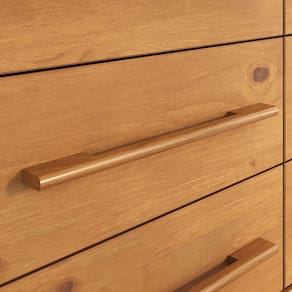 Materiais e Acabamento: Material da Estrutura: Madeira Maciça - Finger | Tipo da Madeira: Pinus | Fundos da Gaveta: MDF | Fundos do Móvel: MDF | Laterais da Gaveta: MDP | Puxadores: Madeira | Escala de Brilho: Fosco | Material dos Pés: Pinus Maciço | Recomendação de Limpeza: Utilize pano levemente úmido