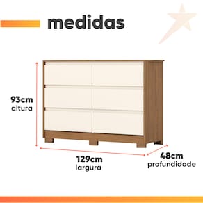 MEDIDAS: A = 93 cm L = 129 cm P = 48 cm GAVETAS SUPORTAM ATÉ: 3 kg TAMPO SUPORTA ATÉ: 10 kg CÔMODA SUPORTA ATÉ: 20 kg PESO: 43 kg MODELO: Cômoda 6 Gavetas Palma MARCA: Henn ACABAMENTO: Pintura UV texturizada MATERIAL: MDP QUANTIDADE DE GAVETAS: 6 CORREDIÇAS: Telescópicas, abertura suave QUANTIDADE DE PUXADORES: 6 unidades, em cava QUANTIDADE DE PÉS: 6 unidades DIFERENCIAL: corrediças telescópicas ITENS INCLUSOS: 1 Cômoda, 1 Manual de montagem, 1 Kit Parafusos. SISTEMA DE MONTAGEM: Parafusos e Cavilhas INSTRUÇÕES E CUIDADOS: Para limpeza de seu móvel, use uma flanela limpa e seca. Não utilize produtos químicos que possam danificar o produto. GARANTIA: 3 Meses