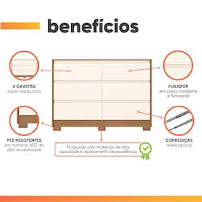 A Cômoda Palma une praticidade e design sofisticado para deixar seu ambiente mais organizado e elegante. Com 6 gavetas espaçosas, oferece amplo espaço interno para guardar roupas e objetos de forma funcional. Possui puxadores embutidos em cava, modernos e discretos, além de corrediças telescópicas que garantem abertura suave e durabilidade no uso diário. Seus pés são produzidos em material ABS de alta resistência, proporcionando estabilidade e maior vida útil ao móvel.
