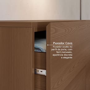 Fabricada em MDP de alta qualidade com detalhes ripados em MDF, a cômoda é um exemplo de como a combinação de materiais e acabamentos pode resultar em um visual moderno e atemporal. Os puxadores discretos com cavas e o acabamento texturizado reforçam sua elegância e versatilidade.