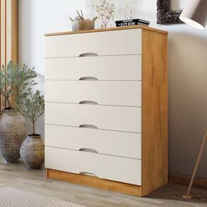 Com 6 gavetas espacosas equipadas com corredicas telescopicas, voce garante um deslizamento suave e duradouro, ideal para organizar roupas e acessorios com praticidade. O tampo reforcado de 25 mm, somado as costas e fundos das gavetas parafusados, assegura estabilidade e uma estrutura solida.