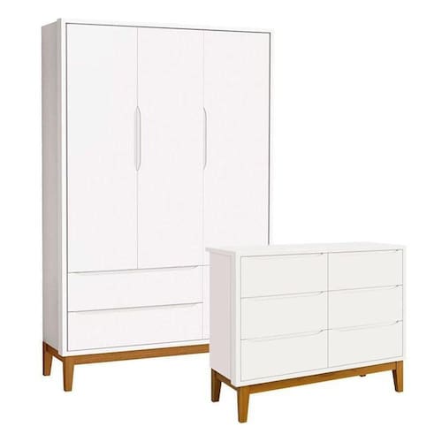 Cômoda 6 Portas e Guarda Roupa Infantil 3 Portas New Classic Branco Acetinado com Pés Madeira - Reller