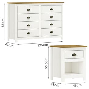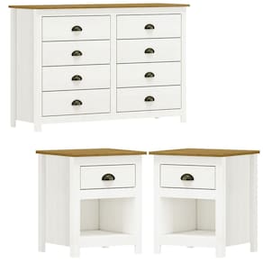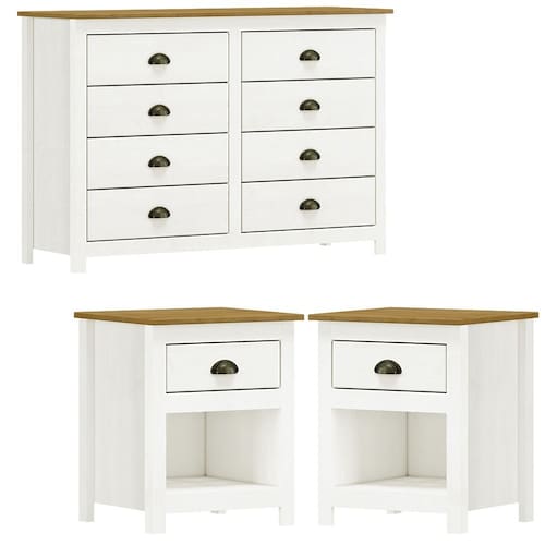Conjunto Cômoda e 02 Mesas de Cabeceira projetado para quem busca móveis sofisticados e atemporais. Produzido em madeira maciça de pinus de reflorestamento, sua estrutura robusta garante durabilidade e resistência. Seu acabamento com pintura acetinada em verniz PU e UV realça a beleza natural da madeira enquanto protege contra desgastes do dia a dia. A Cômoda possui 08 gavetas, e as Mesas de Cabeceira 01 gaveta e 01 Nicho. As gavetas contam com corrediças telescópicas, permitindo uma abertura suave e silenciosa. Além disso, o design apresenta puxadores metálicos no estilo concha que agregam um charme artesanal, e pés alongados em madeira que trazem leveza e sofisticação ao móvel. Estes móveis chegarão em sua casa separados em 03 volumes.