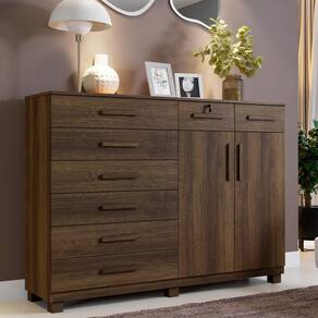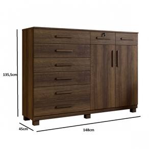 A Cômoda Triunfo vem com a proposta de completa seu quarto com muito charme e beleza, possui 8 gavetas bem espaçosa sendo 1 com chave com corrediças telescópica que dá muita suavidade e resistência, ainda conta com 2 portas, tem 2 prateleira interna que constitui uma sapateira bem definida, além de possuir tampo de 15 mm que garante uma vida útil.