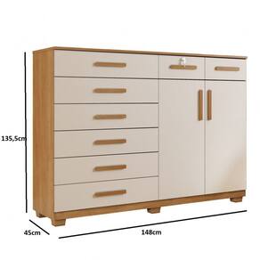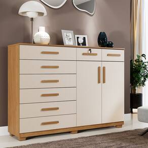 A Cômoda Triunfo vem com a proposta de completa seu quarto com muito charme e beleza, possui 8 gavetas bem espaçosa sendo 1 com chave com corrediças telescópica que dá muita suavidade e resistência, ainda conta com 2 portas, tem 2 prateleira interna que constitui uma sapateira bem definida, além de possuir tampo de 15 mm que garante uma vida útil.