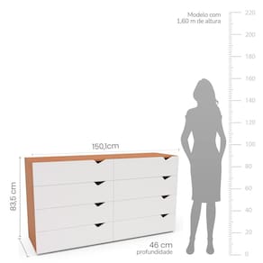 A cômoda 8 gavetas Porto, da Politorno Móveis, combina design moderno, elegante e sofisticado, trazendo um toque de requinte para qualquer ambiente. Fabricada em MDP/MDF, possui acabamento em pintura UV e FF, garantindo maior durabilidade e resistência. Seus puxadores embutidos conferem um visual clean e sofisticado, enquanto as corrediças telescópicas proporcionam um deslizamento suave das gavetas. Com dimensões de 83,5 cm de altura, 150,1 cm de largura e 46 cm de profundidade, oferece amplo espaço para organização, sendo ideal para quartos e closets. De alta qualidade, essa cômoda alia funcionalidade e estilo para um ambiente bem estruturado. Produto Montado: Sim Acabamento da Gaveta: Pintura UV Acabamento dos Pés: Poliéster Altura dos Pés: cm Ambiente Principal: Quarto codigo_ean: 7900288109682 Complexidade da Montagem: Média: pode ser montado por mais de uma pessoa e/ou necessite de maior conhecimento para montagem Cor: Freijó/Branco Cor do Produto: Freijó/Branco Cor Interna: Freijó Escala de Brilho: Semi-Fosco Escala de Brilho da Gaveta: Semi-Fosco Gaveta com Chave: Não Itens Inclusos: 1 Cômoda, Kit de Ferragens, Manual de Montagem e Termo de Garantia Linha ou Coleção: Porto Manual de Montagem e Instalação: https://product-hub-prd.madeiramadeira.com.br/983925/documents/f294ba72-0dd9-4c71-bae0-4b19d81c44cd2781156622417436226695687.pdf Marca: Politorno Material da Gaveta: MDF/MDP Material do Fundo: MDF/MDP Material dos Pés: Plástico Material Principal: MDF/MDP Necessita Montagem: Sim Origem do Produto: Nacional Pés Reguláveis: Não Peso: 33,96 kg Peso Máximo por Gaveta: 5 kg Possui Espelho: Não Possui Nichos: Não Possui Pés: Não Possui Portas: Não Possui Prateleiras: Não Possui Rodízio: Não Quantidade de Gavetas: 08 Gavetas Recomendações de Uso, Manutenção e Limpeza: Utilize um pano macio umedecido com água e sabão neutro, seguido de pano seco. Não utilize produtos químicos ou abrasivos para limpeza, pois estes danificam o revestimento do móvel. Sapatas Niveladoras: Sim Sistema de Montagem: Cavilha, Parafuso, Minifix e prego Suporta Até (kg): 60 kg Tipo de Cômoda: Adulto Tipo de Corrediça da Gaveta: Metálica Telescópica Tipo de Puxador da Gaveta: Embutido undefined: 983929