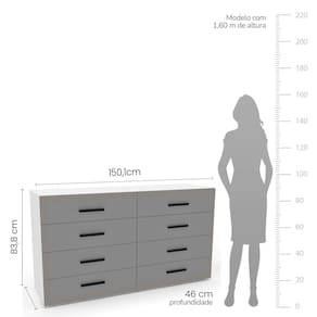 A cômoda 8 gavetas Valência, da Politorno Móveis, combina sofisticação, modernidade e alta funcionalidade para a organização do ambiente. Com 83,5 cm de altura, 150 cm de largura e 46 cm de profundidade, oferece amplo espaço para armazenar roupas e acessórios de forma prática. Produzida em MDP/MDF, conta com acabamento em pintura UV e FF, garantindo resistência e durabilidade. Seu design elegante se destaca pelos detalhes usinados, que agregam um toque refinado ao móvel. Além disso, os puxadores externos proporcionam praticidade no manuseio, enquanto as corrediças telescópicas garantem um deslizamento suave e preciso das gavetas. Ideal para quem busca qualidade e sofisticação no dia a dia. Produto Montado: Sim Acabamento da Gaveta: Pintura UV Acabamento dos Pés: Polipropileno Altura dos Pés: cm Ambiente Principal: Quarto codigo_ean: 7900288113795 Complexidade da Montagem: Média: pode ser montado por mais de uma pessoa e/ou necessite de maior conhecimento para montagem Cor: Branco/Cinza Cor do Produto: Branco/Cinza Cor do Puxador: Preto Cor Interna: Branco Escala de Brilho: Semi-Fosco Escala de Brilho da Gaveta: Semi-Fosco Gaveta com Chave: Não Itens Inclusos: 1 Cômoda, Kit de Ferragens, Manual de Montagem e Termo de Garantia Linha ou Coleção: Valência Manual de Especificação Técnica: https://product-hub-prd.madeiramadeira.com.br/984476/documents/7530f553-a3eb-4dfb-bf5b-f6974be5ece92803924622417440259985653.pdf Manual de Montagem e Instalação: https://product-hub-prd.madeiramadeira.com.br/984476/documents/23f4c994-9f15-482b-8a07-552c9ef5a4852803928622417440260675881.pdf Marca: Politorno Material da Gaveta: MDF/MDP Material do Fundo: MDF/MDP Material do Puxador da Gaveta: MDF Material dos Pés: Plástico Material Principal: MDF/MDP Necessita Montagem: Sim Origem do Produto: Nacional Pés Reguláveis: Não Peso: 39,95 kg Peso Máximo por Gaveta: 5 kg Possui Espelho: Não Possui Nichos: Não Possui Pés: Não Possui Portas: Não Possui Prateleiras: Não Possui Rodízio: Não Quantidade de Gavetas: 08 Gavetas Recomendações de Uso, Manutenção e Limpeza: Utilize um pano macio umedecido com água e sabão neutro, seguido de pano seco. Não utilize produtos químicos ou abrasivos para limpeza, pois estes danificam o revestimento do móvel. Sapatas Niveladoras: Sim Sistema de Montagem: Cavilha, Parafuso, Minifix e prego Suporta Até (kg): 60 kg Tipo de Cômoda: Adulto Tipo de Corrediça da Gaveta: Metálica Telescópica Tipo de Puxador da Gaveta: Externo undefined: 982075