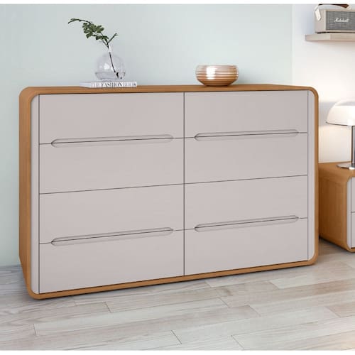 Cômoda 8 Gavetas Loop II Lopas, estrutura em MDF/MDP, com alta durabilidade e resistência, garantindo uma estrutura robusta. Todas as quinas do produto são arredondadas. O tampo da cômoda tem 15mm de espessura e é boa para guardar objetos decorativos. Tem oito gavetas grandes, com corrediças telescópicas, puxadores de gavetas embutidos e acabamento em poliuretano.