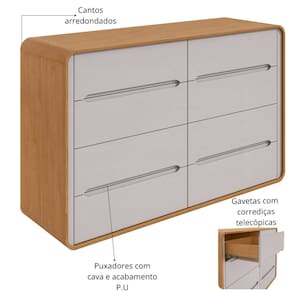 Características: Estrutura em MDF/MDP Cantos arredondados em todas as quinas do produto Tampo de 15mm Puxadores com cava e acabamento P.U. 8 Gavetas Corrediças telescópica Fundo das gavetas e costas em HDF Tampo suporta até 30Kg Gaveta suporta até 5kg
