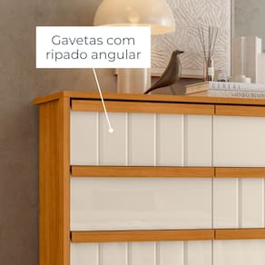 Com design contemporâneo e acabamento sofisticado, a Cômoda Tarsila une o melhor dos dois mundos: estética e organização. Com suas gavetas ripadas com ângulo, que imprimem charme e modernidade ao móvel; peça composta por 8 gavetas que garantem que tudo ficará bem armazenado. Conta ainda com corrediças telescópicas garantem abertura suave e eficiente, suportando até 3kg cada uma.