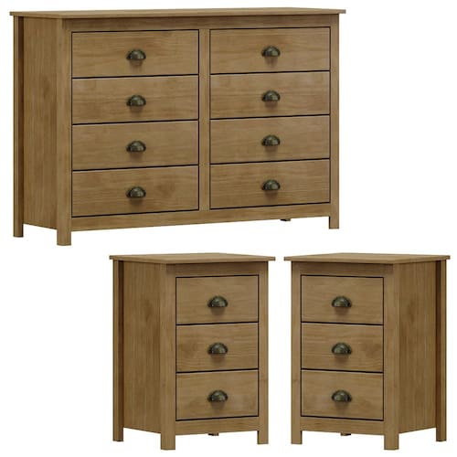 Conjunto Cômoda e 02 Mesas de Cabeceira projetado para quem busca móveis sofisticados e atemporais. Produzido em madeira maciça de pinus de reflorestamento, sua estrutura robusta garante durabilidade e resistência. Seu acabamento com pintura acetinada em verniz PU e UV realça a beleza natural da madeira enquanto protege contra desgastes do dia a dia. A Cômoda possui 08 gavetas, e as Mesas de Cabeceira 03 gavetas, que contam com corrediças telescópicas, permitindo uma abertura suave e silenciosa. Além disso, o design apresenta puxadores metálicos no estilo concha que agregam um charme artesanal, e pés alongados em madeira que trazem leveza e sofisticação ao móvel. Estes móveis chegarão em sua casa separados em 03 volumes.