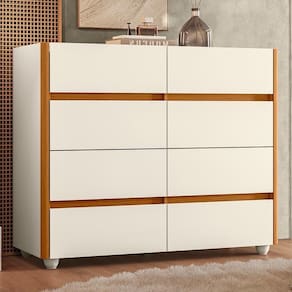 Cômoda Aparador 8 Gavetas Off White/cinamomo Com Tampo De Vidro - Móveis Albatroz Off White/cinamomo Cômoda Aparador 8 Gavetas com Tampo de Vidro - Móveis Albatroz A Cômoda Aparador 8 Gavetas é uma combinação perfeita de elegante e funcionalidade. Produzida em MDP com pintura UV, oferece durabilidade e um acabamento sofisticado. Suas oito gavetas quadradas contam com corrediças telescópicas que garantem um deslize suave e segura. Os cantos arredondados de MDF revestidos proporcionam um visual moderno e mais no uso diário. O tampo estilo bandeja com vidro incolor adiciona um toque diferenciado ao design, enquanto os pés em ABS elevam o móvel, garantindo estabilidade e facilitando a limpeza. Ideal para quem busca organização com um toque refinado na decoração. ESPECIFICAÇÕES: - Estrutura em MDP - Pintura UV - 8 Gavetas - Corrediças telescópicas - Cantos arredondados de MDF revestidos - Tampo estilo bandeja com vidro incolor - Pés em ABS
