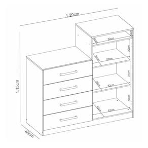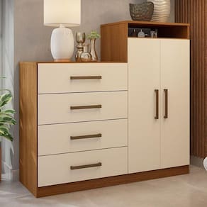 A Cômoda Áurea é elegante que complementa o ambiente e oferece muita praticidade. Com quatro gavetas espaçosas e um armário de duas portas com duas prateleiras internas, espaço para acomodação de roupas e objetos não será um problema. Ainda conta com um nicho na parte superior para itens menores ou objetos de decoração. Com puxadores na cor bronze, sua fabricação é feita em MDP de alto padrão, com acabamento resistente, proporcionado por sua pintura UV.