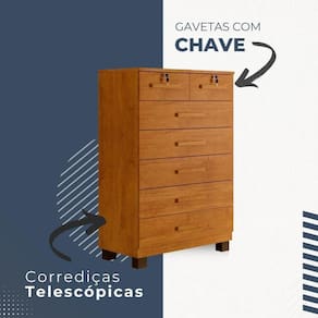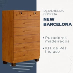 A Cômoda Barcelona completa seu quarto com muito charme e beleza, possui 7 gavetas muito espaçosa sendo 1 com chave com corrediças telescópica que dá muita suavidade e resistência, ainda conta com 2 portas e 2 prateleiras.