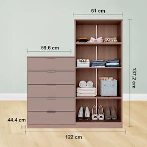 Ela possui 4 prateleiras para acomodar roupas, travesseiros, caixas, sapatos , lençóis e cobertas com muita organização e praticidade. Oferece 5 gavetas para armazenar roupas íntimas, biquínis, gravatas, meias, camisetas, acessórios e demais peças menores. As corrediças metálicas facilitam a abertura, tornando o movimento mais suave.