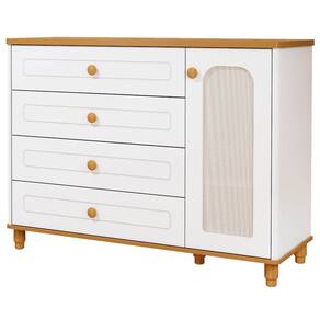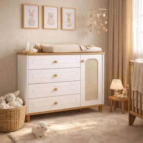 Com estilo retrô e acabamento refinado, a cômoda se destaca pelas linhas suaves, detalhes delicados e materiais de alta qualidade, trazendo charme e sofisticação para o ambiente infantil.