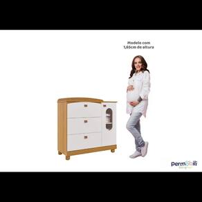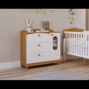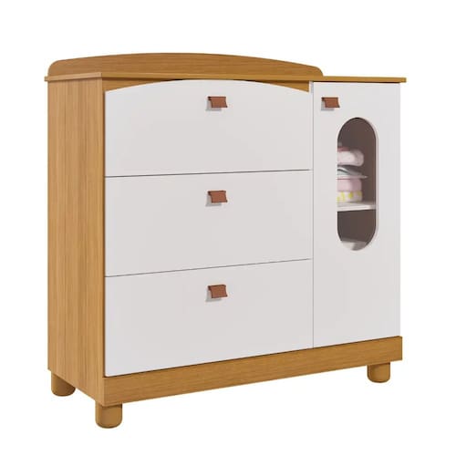 Suas formas curvas conferem ao móvel um toque decorativo no quarto dos pequenos. Possui 3 gavetas grandes com corrediças metálicas e fundo encaixado que proporciona maior resistência. Possui também 1 porta de abrir com prateleira interna e 1 cabideiro para você montar de acordo com sua necessidade. Seu tampo possui bordas arredondadas que recebem pintura em lacca com tinta atóxica e as peças retas recebem pintura UV também com tinta e verniz atóxicos. Fabricada com matéria-prima 100% MDF, um material ecologicamente correto e de ótima durabilidade e resistência. A porta possui detalhe vazado que recebe um material transparente que é PETG cristal, um termoplástico resistente a impactos e de excelente acabamento.