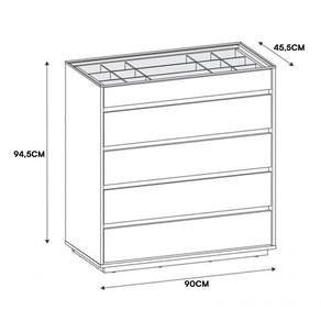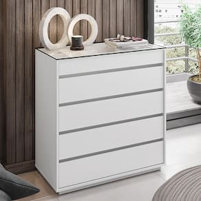 Cômoda Belize Belize 5 Gavetas - Casa D A Cômoda Belize 5 Gavetas é a escolha perfeita para trazer organização e sofisticação ao seu quarto. Com um design elegante e funcional, ela possui cinco gavetas, sendo a superior equipada com um organizador interno em MDF, ideal para armazenar joias e relógios com segurança. Todas as gavetas contam com corrediças telescópicas que garantem um deslizamento suave e eficiente. O tampo de vidro de 8mm confere um toque moderno, enquanto a estrutura robusta em MDP com base e laterais de 25mm, junto às cinco travessas transversais de 15mm, assegura estabilidade e resistência. O acabamento exclusivo Print Wood, patenteado pela Casa D, proporciona durabilidade e uma qualidade superior, destacando-se no mercado. Essa cômoda é ideal para quem busca unir praticidade e beleza em um só móvel.