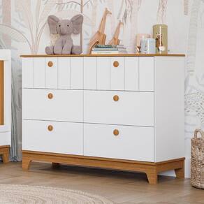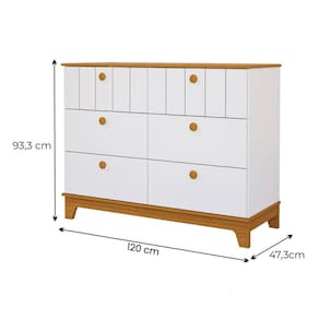 Com 6 gavetas espaçosas com corrediças telescópicas, puxadores em madeira maciça e detalhes em baixo relevo, essa cômoda une estilo e funcionalidade.