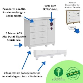 A Cômoda Infantil Bolinha é um produto que atende a diversos ambientes de sua casa, ideal para seu bebê, sua criança e até para uso adulto. Possui o tampo com bordas laqueadas e tem o diferencial do rodapé que pode ser montado no desenho reto ou com o rodapé ondulado.