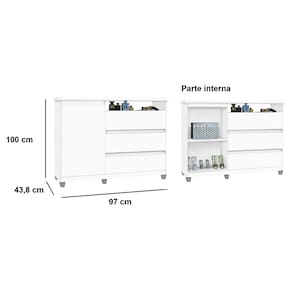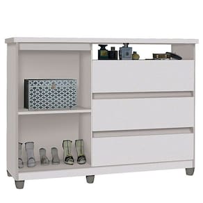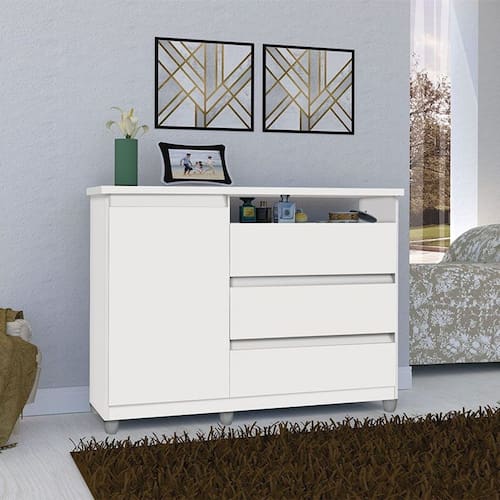 Aliada da organização do seu dormitório, a Cômoda Sky é a peça que faltava para garantir um dia a dia mais otimizado e um ambiente bem decorado. Ela pode ter o uso compartilhado com o do guarda-roupa já que as gavetas se reservam para peças menores e dobráveis, mas se o seu cômodo é pequeno, ela também vai bem como a protagonista para deixar tudo sempre à mão. Ah, além do visual charmoso que ajuda na composição do lar-style, a peça ainda tem um amplo tampo para você dispor cosméticos, enfeites ou outros itens pertinentes à sua rotina. Agora é só combiná-la com o restante do mobiliário e conquistar o quarto dos seus sonhos! Descrição do Tamanho Altura: 100 cm Largura: 97 cm Profundidade: 43,8 cm Características: Número de portas : 1 Porta Número de gavetas: 3 Gavetas Tipo de pé: Fixo de PVC Acabamento: Fosco Material da dobradiça/trilho da porta Metal Material da estrutura MDP Espessura do material da estrutura (mm) 12 Número de nichos: 1 Número de pés 6 Peso suportado máximo (kg) 60 Atenção! - Confira as dimensões deste produto e certifique-se de que passará normalmente por supostos elevadores, portas, escadas e/ou corredores de sua moradia; - As imagens são ilustrativas, eletrodomésticos e demais objetos que compõem o cenário, não fazem parte do anúncio; - Sobre a tonalidade das cores, poderá ocorrer alterações conforme a configuração do seu monitor. - Orientamos que a montagem e instalações do produto seja realizado por um técnico de sua confiança, após a sua entrega. - Oferecemos retirada em nossa loja Saimys Móveis na Av. Ragueb Chohfi, °3411 (08341-420) para não haver custo de envio.