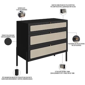 03 gavetas com corrediças telescópicas e aplique de tela sintética (PVC com poliéster).