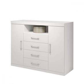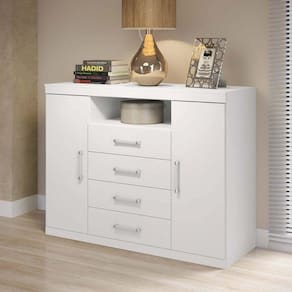 Características Estrutura: MDP 12mm e 15mm Acabamento: Pintura Quantidade e Tipo de Portas: 2 Tipo de Dobradiças/Trilhos: Dobradiças Metálicas Simples Quantidade de Gavetas: 4 Tipo de Corrediças: Metálicas Tipo de Puxadores: Plástico ABS Quantidade e Tipo de Cabideiros: 1 em Alumínio Quantidade de Prateleiras: 1 Suporte até: 30kg no tampo, 10kg no nicho e 3kg por gaveta. Manutenção: Não limpar com álcool ou qualquer outro produto químico, utilize somente pano seco ou levemente umedecido. Sistema de Montagem: Cavilhas, Parafusos e Minifix Itens Inclusos: 1 Cômoda, Kit ferragens e Manual de montagem Garantia de Fabrica: 3 meses
