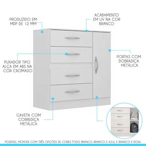 Voc? merece o melhor quando se trata de m?veis para sua casa e a escolha certa para atender todas as suas necessidades. Com um design atual, une versatilidade, conforto e beleza. Com quatro gavetas e uma porta, voc? ter? muito espa?o para manter tudo organizado e ao alcance das m?os. Disp?e da montagem flex, possibilitando escolher qual cor combina mais com o seu ambiente, toda branca, branca e azul ou branca e rosa. Produzida com materiais de excelente qualidade, garantindo a sua resist?ncia ao desgaste di?rio e mantendo sua beleza e funcionalidade por muito tempo. O melhor em m?veis no design atual aliando conforto, qualidade e ?timos pre?os, s? na Menu M?veis!