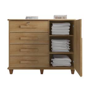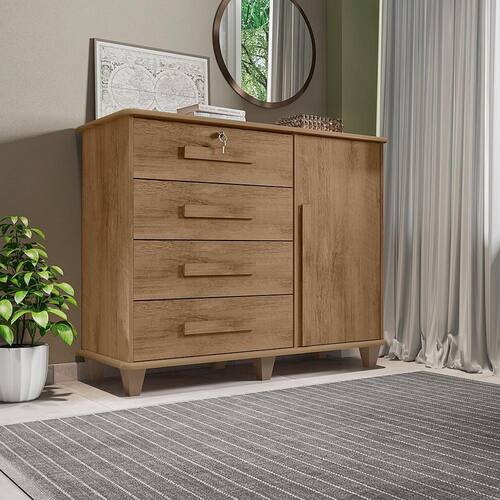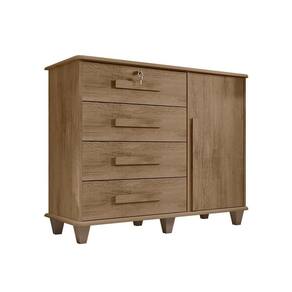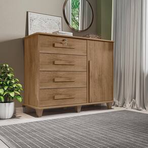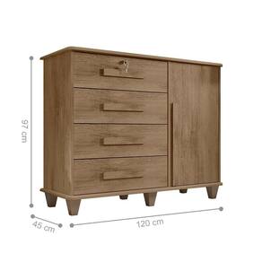 Com 4 gavetas de corrediças metálicas possui acabamento interno em linho, e puxadores em madeira nas gavetas e na porta, que conta também com dobradiças metálicas.