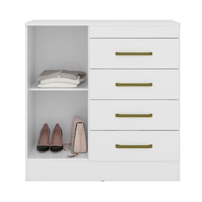 Características: Material da Estrutura em MDP Acabamento em Pintura UV 04 Gavetas com corrediças metálicas 01 Porta com dobradiças metálicas Puxadores em Plástico ABS
