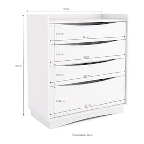 O produto será entregue desmontado e não disponibilizamos o serviço de montagem. Acabamento: Pintura UV | Tonalidade: Branco | Material: MDP | Referência do Modelo: CR35152 | Coleção: Cômodas | Instruções de Cuidado: Limpar com pano seco para retirar o pó. Não utilizar produtos químicos ou abrasivos a limpeza. Não aplicar lustra móveis. | Sistema de Montagem: O produto acompanha manual de montagem e kit ferragem. O produto será entregue desmontado e não disponibilizamos o serviço de montagem, Parafuso Philips e Minifix | Com Gaveteiro: Sim | Produto Composto por: 1 cômoda, manual de montagem e kit ferragem. | Corrediça: Telescópicas | Material do Puxador: N/A | Quantidade de Gavetas: 4 | Quantidade de Portas: 0 | Quantidade de Prateleiras: 0 | Altura Montado: 101 | Largura Montado: 91 | Profundidade Montado: 45 | Tamanho (L x A x P): 91 x 101 x 45 | Garantia do Fabricante: 3 | Peso do Produto: 42 | É Desmontável: Sim | Fabricante: Kappesberg | Produto: Cômoda | Altura (cm): 101 cm | Largura ( Ean: 7909103728336
