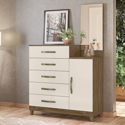 A Cômoda Lisboa é feita em MDP e possui um excelente espaço para sapateira. O móvel tem 5 gavetas amplas para você guardar seus pertences. Os puxadores são na Cr bronze, as corrediças são metálicas e pés em PVC. Acabamento: Impressão Acabamento da Gaveta: Impressão Acabamento da Porta: Impressão Acabamento da Prateleira: Impressão Acabamento dos Pés: Poliéster Altura: 170 cm Altura do Espelho: 70 cm Altura dos Pés: 7 cm Ambiente Principal: Quarto calculo: unidade Complexidade da Montagem: Média: pode ser montado por mais de uma pessoa e/ou necessite de maior conhecimento para montagem Cr: Castanho Wood/Baunilha Cr do Produto: Castanho Wood/Baunilha Cr Interna: Castanho Escala de Brilho: Brilhante Escala de Brilho da Gaveta: Brilhante Escala de Brilho da Porta: Brilhante Escala de Brilho da Prateleira: Semi-Brilho Espessura do Espelho: 3 mm Estilo: Moderno Formato do Espelho: Retangular Gaveta com Chave: Não Itens Inclusos: 1 Cômoda, Kit Ferragens e Manual de Montagem Largura: 104 cm Largura do Espelho: 35 cm Linha ou Coleção: Complementos Manual de Montagem e Instalação: https://cdn2.madeiramadeira.com.br/atributo/moval/742882-640-20-9371-c-moda-lisboa.pdf Material da Gaveta: MDP Material da Porta: MDP Material da Prateleira: MDP Material do Fundo: HDF Material do Puxador da Gaveta: Plástico Material do Puxador da Porta: Plástico Material dos Pés: PVC Material Principal: MDP Montagem Flex: Não Necessita Montagem: Sim Origem do Produto: Nacional Pés Reguláveis: Não Peso: 45,2 kg Peso Máximo por Gaveta: 6 kg Peso Máximo por Prateleira: 6 kg Possui Espelho: Sim Possui Gavetas: 05 Possui Nichos: Não Possui Pés: 04 Possui Portas: 01 Possui Prateleiras: 01 Possui Rodízio: Não Profundidade: 45 cm Quantidade de Espelho: 01 Recomendações de Uso, Manutenção e Limpeza: Limpeza deve ser realizada com pano macio e seco - não utilizar produtos abrasivos Sapatas Niveladoras: Não Sistema de Montagem: Parafuso, cavilhas e girofix status-cadastro: Aprovado Suporta Até (kg): 62 kg Tamanho: Tipo de Corrediça da Gaveta: Metálica Simples Tipo de Dobradiça/Corrediça da Porta: Metálica Tipo de Fixação do Espelho: Parafusos Tipo de Porta: Bater Tipo de Puxador da Gaveta: Externo Tipo de Puxador da Porta: Externo