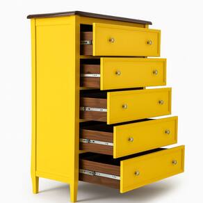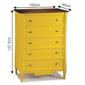 Cômoda Amsterdã conta com 5 gavetas com corrediça telescópica e puxadores metálicos, feita em madeira maciça de reflorestamento, com acabamento em verniz acetinado em tons de madeira e laqueado em tons coloridos.