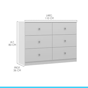 Você merece o melhor quando se trata de móveis para sua casa e a escolha certa para atender todas as suas necessidades. Com um design atual, une versatilidade, conforto e beleza. Com seis gavetas, você terá muito espaço para manter tudo organizado e ao alcance das mãos. Produzida com materiais de excelente qualidade, garantindo a sua resistência e mantendo sua beleza e funcionalidade por muito tempo. O melhor em móveis no design atual aliando conforto, qualidade e ótimos preços, só na Menu Móveis! CARACTERÍSTICAS TÉCNICAS: - Produzido em MDP de 12 e 15 mm - Acabamento UV Brilho na cor Branco - Gavetas com Corrediça Metálica - Puxadores tipo Ponto em ABS na cor Cromada INFORMAÇÕES TÉCNICAS: Altura: 80 cm Largura: 110 cm Profundidade: 36 cm Peso: 35,3 kg INFORMAÇÕES ADICIONAIS: - ATENÇÃO: Não trabalhamos e não nos responsabilizamos pela montagem do móvel. Antes da montagem conferir se o produto está de acordo com o que comprou, produto montado e danificado pela montagem não será aceito troca. - As imagens ambientadas são meramente ilustrativas e podem apresentar itens que não compõe o produto. As cores do produto podem variar de acordo com o monitor, a iluminação do ambiente ou sua percepção visual. - Limpeza: Deve ser feita com pano macio e seco ou levemente umedecido com água e sabão neutro. Não devem ser utilizados abrasivos como palha de aço e objetos cortantes. Garantia para defeitos de fabricação conforme Código de Defesa do Consumidor.