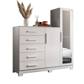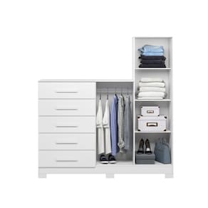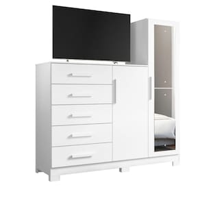Características: Estrutura em MDP 5 GAVETAS Corrediças telescópicas 2 portas sendo uma com espelho parafusados na porta Tampo superior em 15mm Cabideiro de alumínio Puxadores de mdf revestidos Espaço para tv de até 43 polegadas
