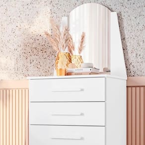Tampo Amplo e Resistente: O tampo da cômoda oferece um espaço generoso para acomodar diversos objetos, como itens de decoração, cosméticos ou até mesmo eletrônicos. Sua estrutura resistente garante durabilidade e suporte, proporcionando segurança e estabilidade para todos os seus pertences.