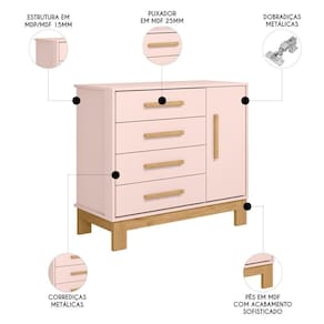 A Cômoda Sapateira possui quatro gavetas excelente profundidade e uma porta convencional com corrediças metálicas que serve como sapateira, proporcionando ainda mais organização para itens de vestuário e demais objetos. As gavetas são equipadas com corrediças metálicas para um deslizar suave. Os pés em MDF de 25mm garantem estabilidade e elegância ao móvel, enquanto os puxadores de em MDF, com alto padrão de acabamento, complementam o design sofisticado. O excelente acabamento revestido em pintura UV destaca ainda mais a cor escolhida, proporcionando um visual vibrante ao ambiente. Além disso, a cômoda possui sistema antitombamento, oferecendo adicional para uso diário. Essa Cômoda Infantil é para quem busca aliar funcionalidade, e estilo na decoração do ambiente, criando um espaço agradável e bem organizado para todas as necessidades do dia a dia.