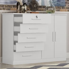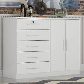 Com a Cômoda Space seu quarto estará completo e seus pertences bem organizados, uma aliada na organização de seu quarto. Fabricada em MDF e MDP, possui 5 gavetas com corrediças telescópicas e sapateira ampla. As corrediças telescópicas são feitas de aço e por isso são mais resistentes e duráveis, permitindo um deslize suave e uma abertura total da gaveta. Agora é só combiná-la com seu mobiliário e conquistar o quarto dos seus sonhos! Aproveite!