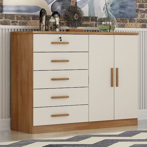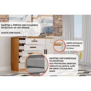 Particularidades da Cômoda: Características: - Produzido com MDF e MDP - 5 Gavetas com corrediças telescópicas - Sapateira - Puxadores em alumínio bronze - Tampo reforçado de 25mm - Gaveta com chave de segurança