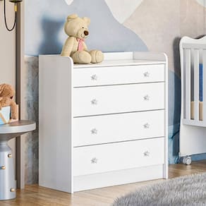 Com quatro gavetas equipadas com corrediças metálicas e excelente profundidade, a organização nunca foi tão encantadora. Os puxadores duplos em formato de estrela, feitos de poliestireno, adicionam um toque celestial ao ambiente, tornando cada momento especial.
