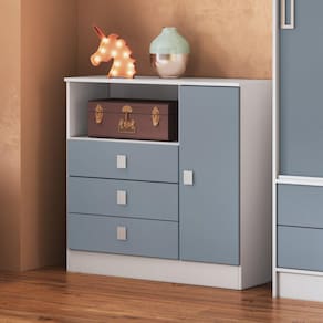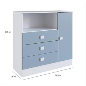 Cômoda em MDP BP branco 15 mm (nas laterais e prateleira), acabamento laca nas frentes de gavetas e porta. Possui quatro gavetas com corrediça telescópica e uma porta com dobradiças metálicas. A cômoda é fabricada em MDP 15 mm. Produto Montado: Sim Acabamento da Gaveta: Laca Acabamento da Porta: Laca Acabamento da Prateleira: Finish Foil Acompanha a Almofada: Não Ambiente Principal: Quarto de Bebê codigo_ean: 7898519564754 Complexidade da Montagem: Média: pode ser montado por mais de uma pessoa e/ou necessite de maior conhecimento para montagem Cor: Branco/Azul Cor: Branco/Azul Cor do Produto: Branco/Azul Cor Interna: Branco Escala de Brilho: Brilhante Escala de Brilho da Gaveta: Brilhante Escala de Brilho da Porta: Brilhante Escala de Brilho da Prateleira: Fosco Gaveta com Chave: Não Itens Inclusos: 1 Cômoda e Manual de Montagem. Linha ou Coleção: Baby Material da Gaveta: MDP Material da Porta: MDP Material da Prateleira: MDP Material do Fundo: T-HDF Material do Puxador da Gaveta: Plástico Material do Puxador da Porta: Plástico Material Principal: MDP Necessita Montagem: Sim Peso: 34,7 kg Peso Máximo por Gaveta: 2 kg Peso Máximo por Prateleira: 2 kg Possui Espelho: Não Possui Nichos: 01 Possui Pés: Não Possui Portas: Sim Possui Prateleiras: Sim Possui Rodízio: Não Possui Trocador: Não Quantidade de Gavetas: 03 Gavetas Quantidade de Prateleiras: 01 Prateleira Recomendações de Uso, Manutenção e Limpeza: É recomeado pano macio para limpezas do dia-a-dia, e pano úmido para tirar a poeira. Sapatas Niveladoras: Não Sistema de Montagem: Parafusos e cavilhas. Tipo de Corrediça da Gaveta: Metálica Telescópica Tipo de Dobradiça/Corrediça da Porta: Metálica Tipo de Porta: Bater Tipo de Puxador da Gaveta: Externo Tipo de Puxador da Porta: Externo Ean: 7898519564754
